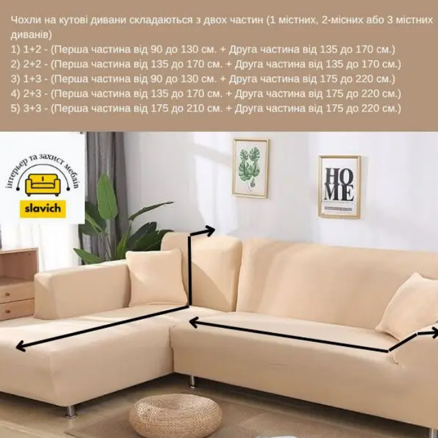 У комплекті 2-а чохла: 2-х місний + 3-х місний чохол – (Перша частина від 135 до 170 см. + Друга частина від 175 до 220 см.)
